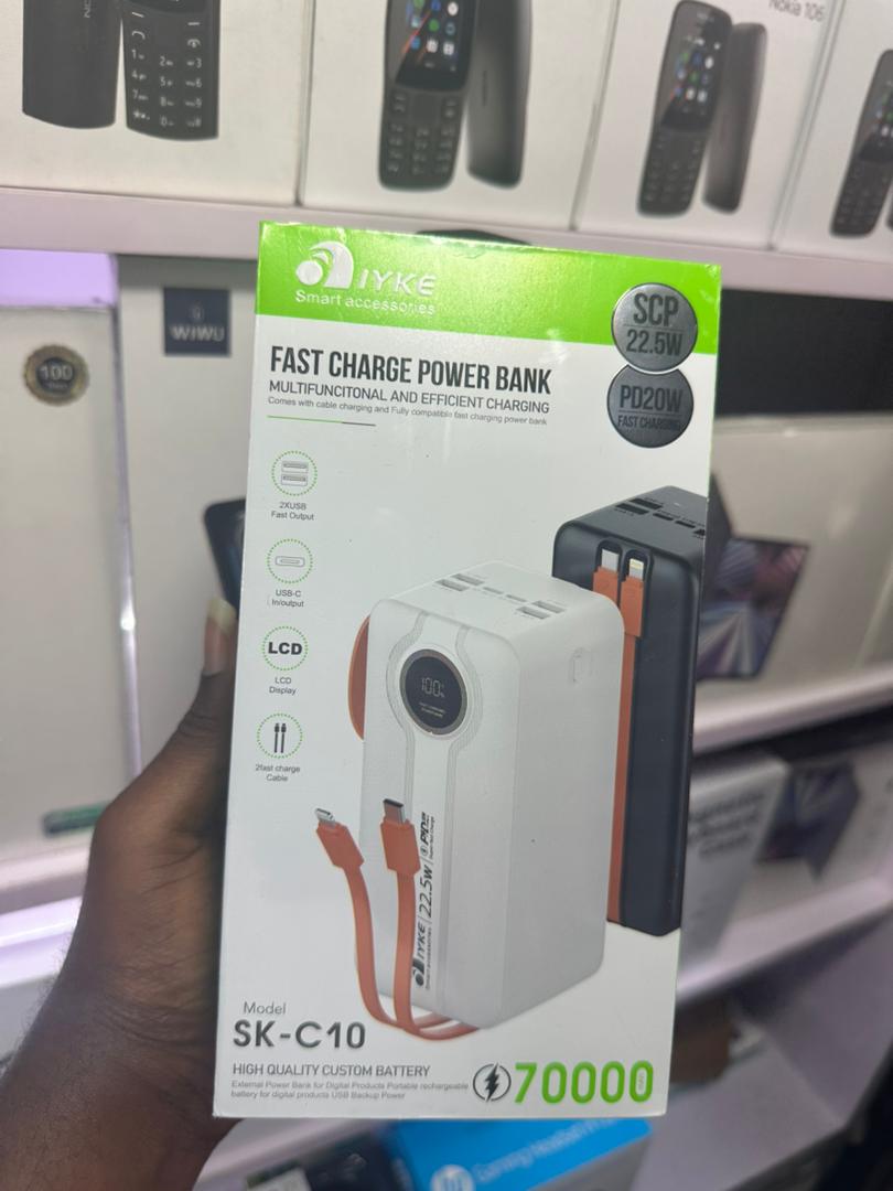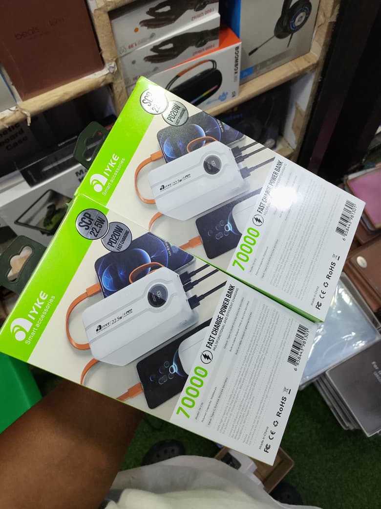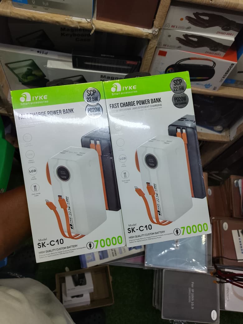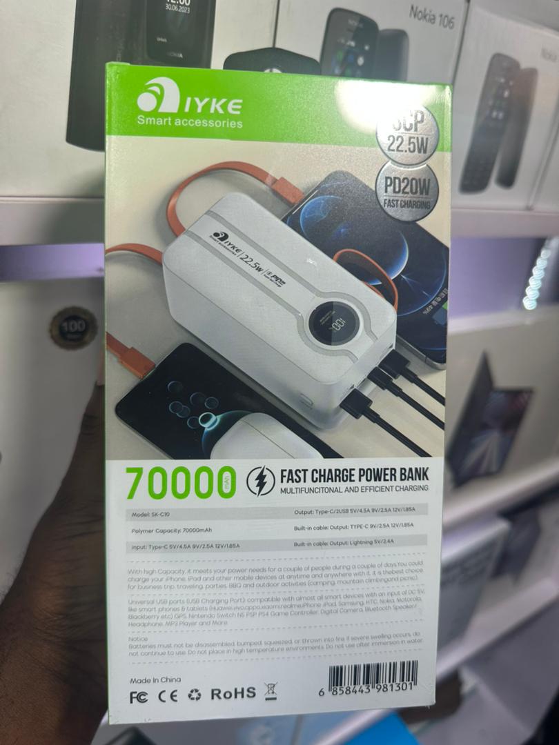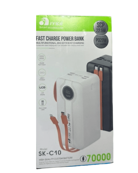 Experience massive power on the go with the 70,000 mAh IYKE Power Bank. Designed for phones, tablets, and gadgets, it features ultra-fast charging, multiple USB outputs, LED display, and intelligent protection — ideal for travel, work, and emergencies.