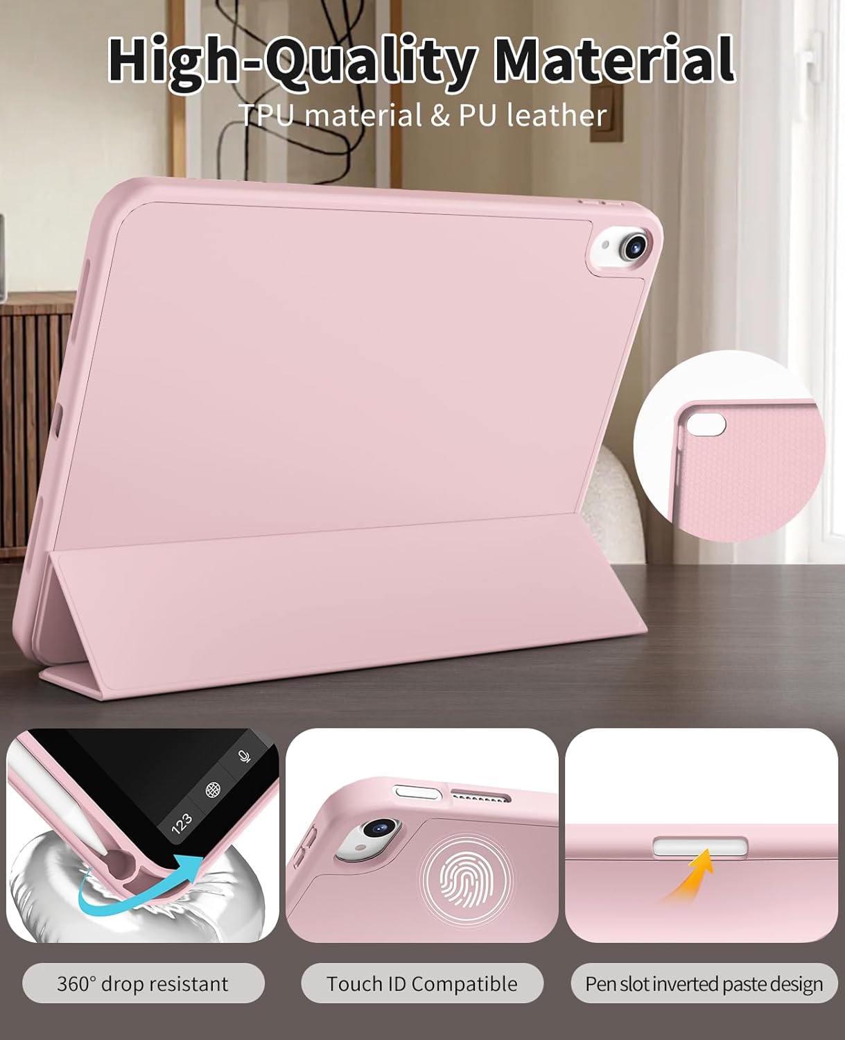 The built-in Apple Pencil holder ensures your stylus is always secure and accessible. Thanks to the trifold folio design, you can easily adjust the iPad into multiple viewing or typing positions—perfect for watching videos, working, or browsing. The auto wake/sleep feature preserves battery life by instantly waking your iPad when you open the cover and putting it to sleep when closed.