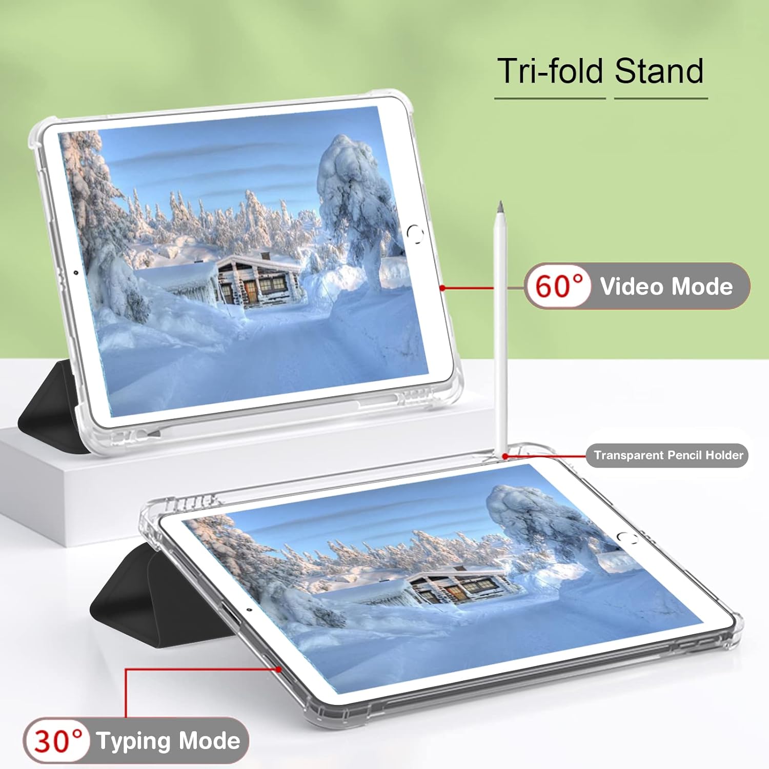 The built-in Apple Pencil holder ensures your stylus is always secure and accessible. Thanks to the trifold folio design, you can easily adjust the iPad into multiple viewing or typing positions—perfect for watching videos, working, or browsing. The auto wake/sleep feature preserves battery life by instantly waking your iPad when you open the cover and putting it to sleep when closed.