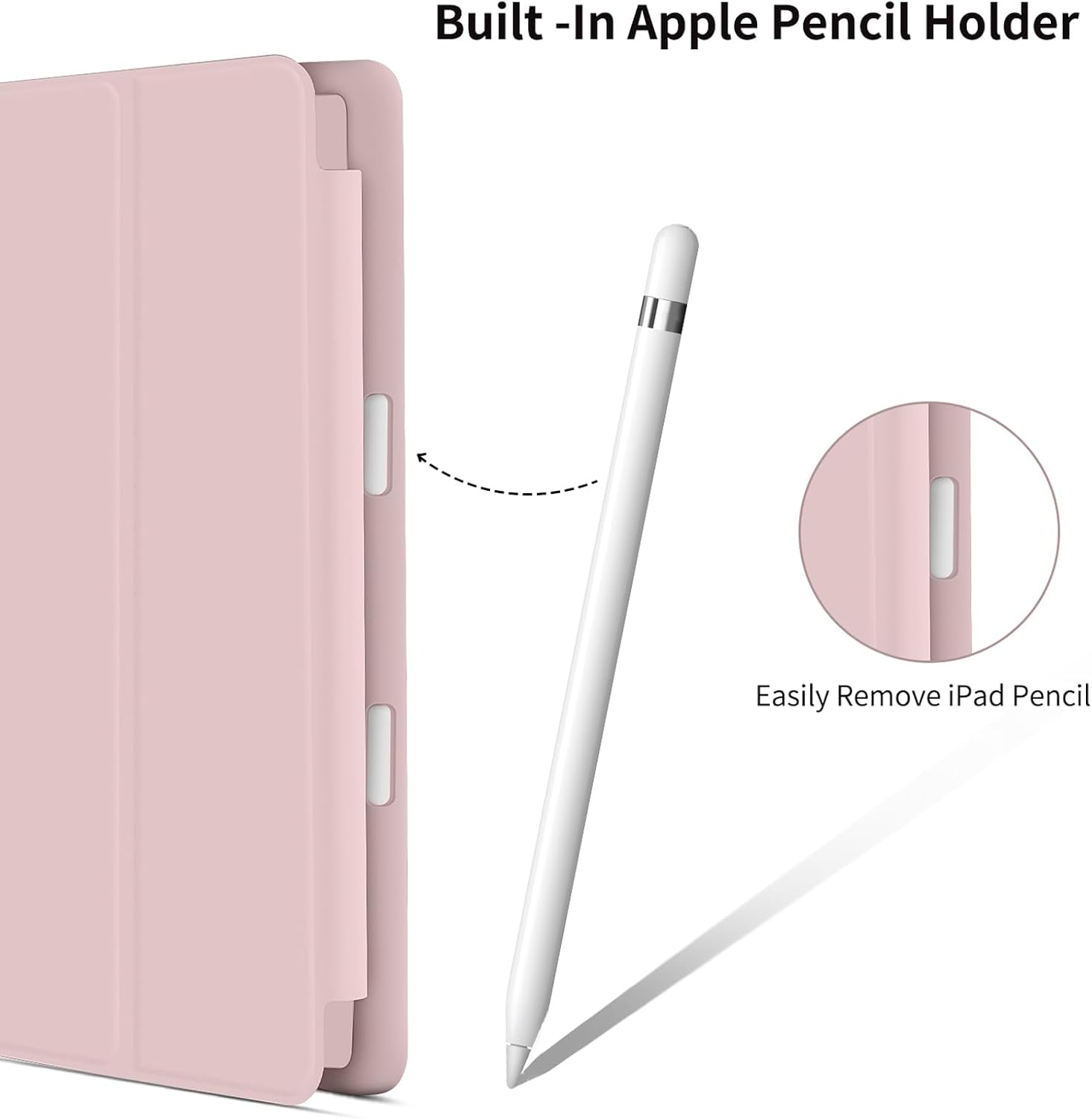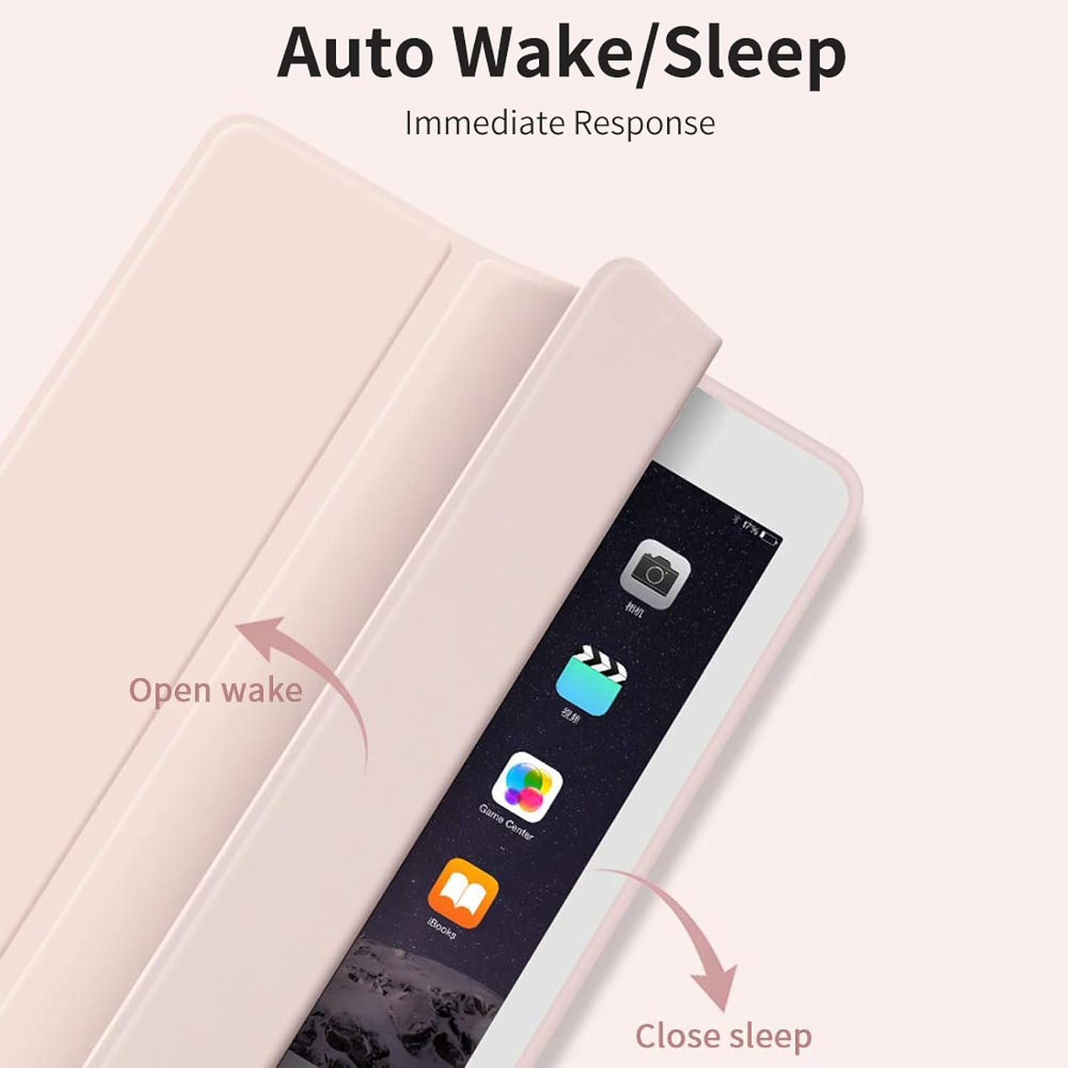 Protect your iPad 7th, 8th, or 9th generation with this pink case. Designed for 10.2-inch models, it includes a pencil holder, soft TPU back, and foldable smart cover. Lightweight and slim, it supports auto wake/sleep for everyday convenience and reliable protection.